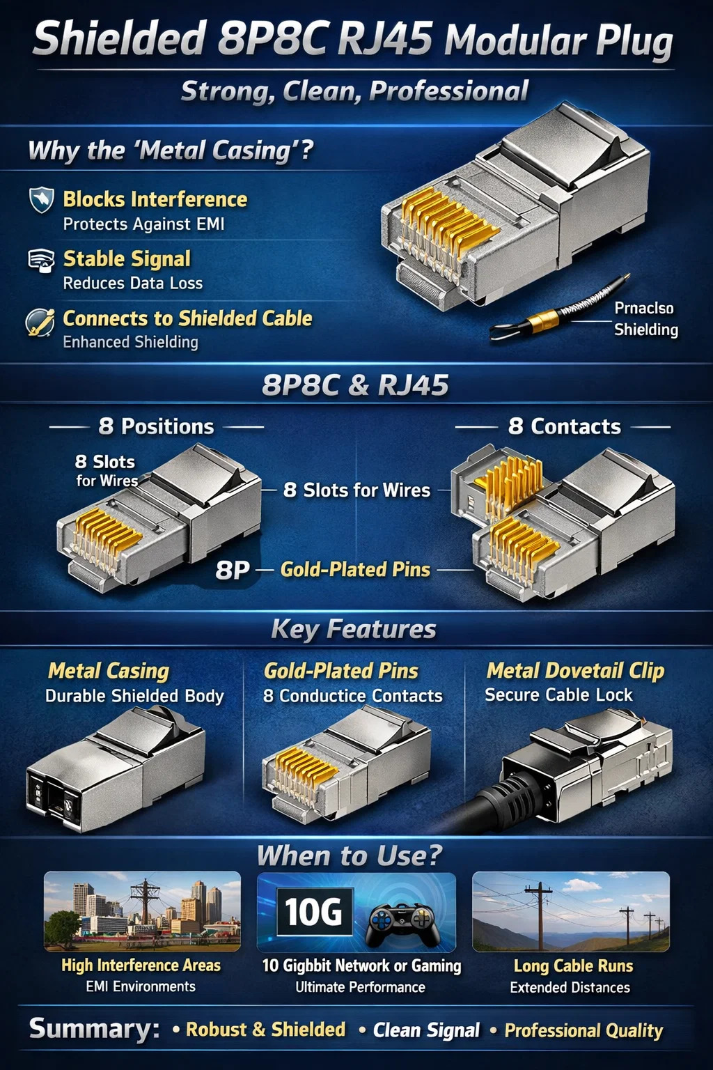 Blockerande störningar: "Shielded" i namnet betyder skärmning. Detta metallhölje fungerar som en skottsäker väst för nätverkskabelkontakten, speciellt utformad för att blockera extern elektromagnetisk störning (som strösignaler från närliggande ledningar eller brus från stora motorer).