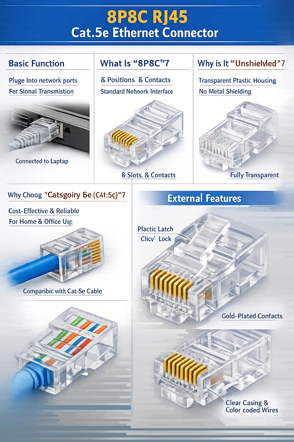 Detta oskärmad 8P8C Cat.5e modulär kontakt är faktiskt den vanligaste typen av "RJ45-kontakt" som finns i många bredbandsnät i hemmet, både förr och nu. Den är transparent, kompakt och en grundläggande komponent för att ansluta till ett nätverk.